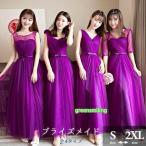 ブライズメイド ドレス ロングドレス チュール 紫 パープル 演奏会 ピアノ発表会 Vネック スレンダーライン ワンピース