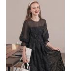 ドレス 「forksy.」「オケージョン対応」フラワーモチーフシアーバルーンスリーブワンピース