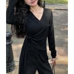 ニット カシュクール レイヤード トップス レディース トップス 長袖 Vネック ニットソー カットソー アシンメトリー リブニット プルオーバー セーター ニット チュニック トップス ストレッチ 薄手 韓国ファッション