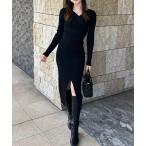 【10%OFFクーポン!4/10(金)1:59まで】ica ワンピース ワンピ タイトワンピース ニットワンピース クラブドレス ボディコン カシュクール ロングスリーブ Vネック スリット ニット 膝下 ひざ丈 きれいめ セクシー 長袖 厚手 無地 大