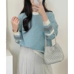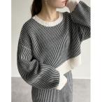 ニット セーター 配色ラインクルーネックニットプルオーバー レディース