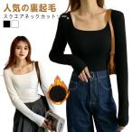 秋冬 暖かい カットソー 長袖 tシャツ 白 ロンt 裏起毛 ニットセーター 黒 リブニット 送料無料 スクエアネック インナー レディース ブラック