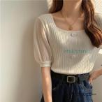 サマーニット レディース 半袖 Tシャツ ニットトップス スクエアネック パフスリーブ トップス シンプル ニット キレイめ 夏 大人 女性用