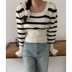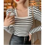 ニット セーター ボーダー柄スクエアネックリブ編みニットトップス レディース