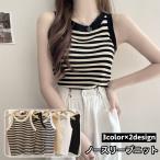 ニット ノースリーブ レディース 女性 トップス 袖なし ラウンドネック サマーニット タンクトップ ボーダー柄 無地 シンプル タイト セクシー 肩