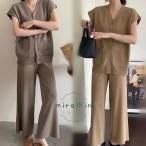セットアップ レディース 夏 ニット フレンチスリーブ トップス ワイドパンツ 50代 40代 30代 20代 ボタン ポケット 半そで 上下セット ルームウェア