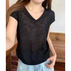 ニット セーター サイドドロストVネックサマーニットトップス/フレンチスリーブスラブニットプルオーバー レディース