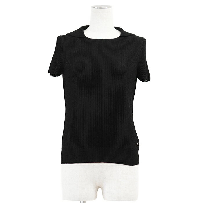 【極美品】CHANEL シャネル リブニット P56135 シグネチャー ロゴ COCOマーク チャーム ポロラウンドカラー フレンチスリーブ 半袖 トップス レディース サイズ 40 ブラック 黒 イタリア製 カール・ラガーフェルド期【中古】