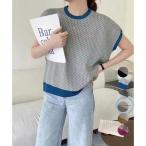 ニット トップス 半袖 透かし編み ベスト ニット Vネック メッシュ サマーニット 重ね着 フレンチスリーブ
