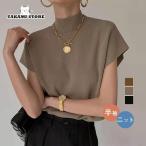 Tシャツ ニットトップス フレンチスリーブ レディース リブニット 半袖 プチハイネック 無地 フラッタースリーブ 二の腕カバー