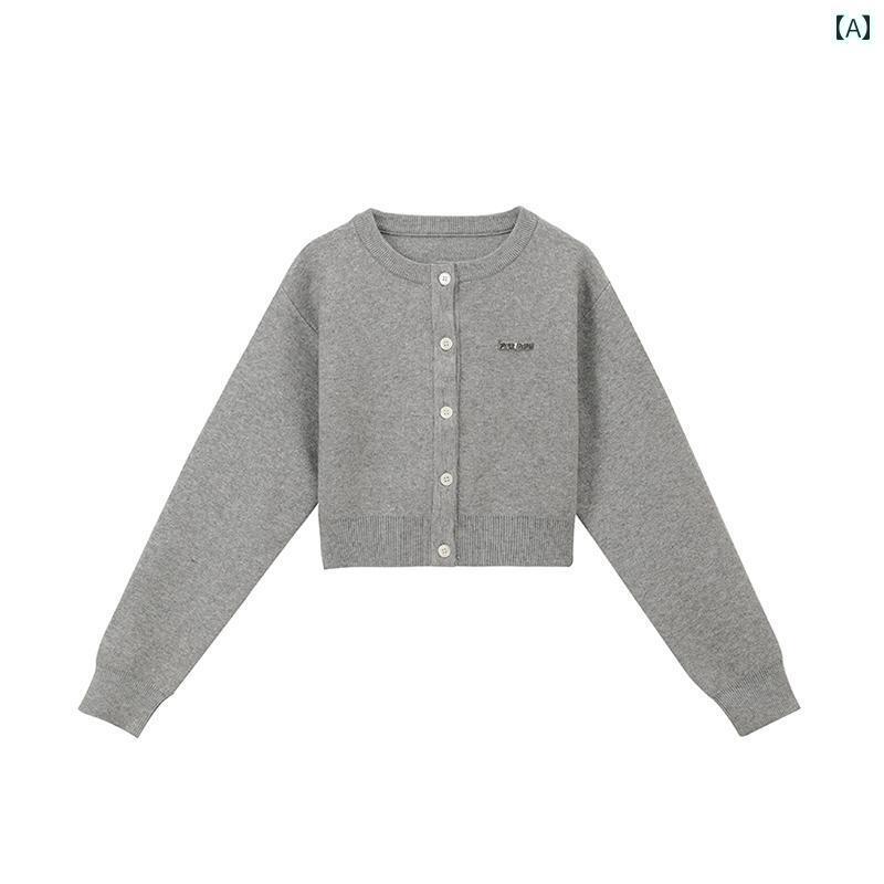 秋 ソフト ショート丈 セーター クロップド カーディガン ルーズ ジャケット ラウンドネック ブラック ブルー グレー ニット