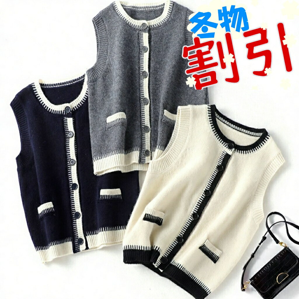 ニットベスト レディース オフィス ノースリーブ ニット ベスト 前開き ウール100% カジュアル ゆったり おしゃれ かわいい クルーネック 丸首 重ね着 レディース トップス ボタン ラウンドネック レイヤード コーデ ニットセーター シンプル アウター インナー 通勤 春 秋