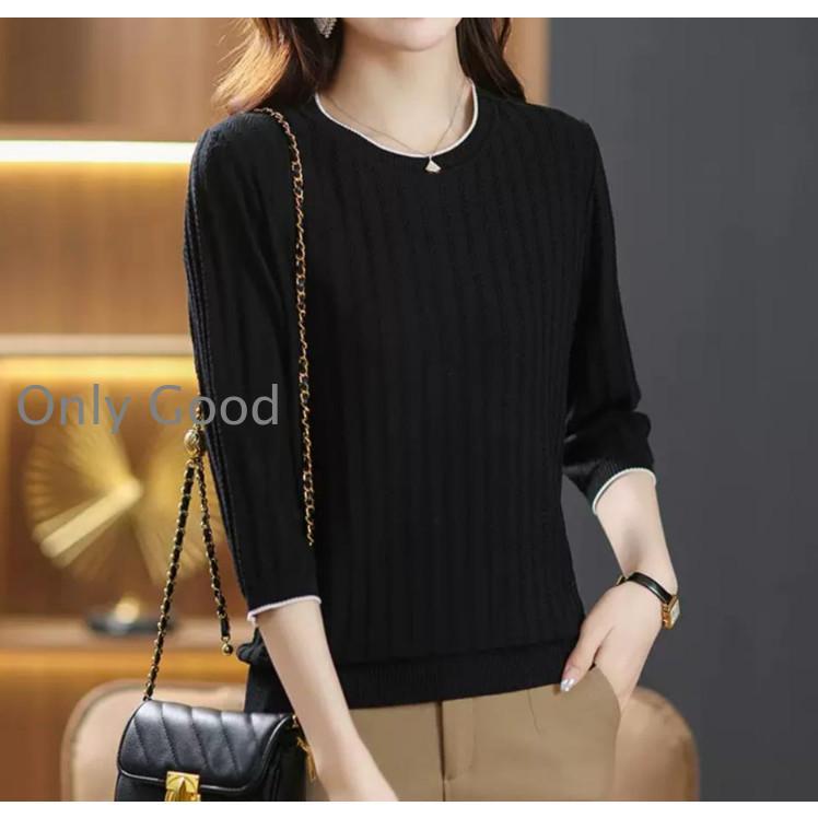 ニット セーター 七分袖配色リブニットプルオーバー レディース