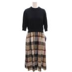 未使用品 ブルーレーベルクレストブリッジ タグ付き バックリボンチェック柄切替ワンピース ロング ニット 七分袖 36 ベージュ 紺
