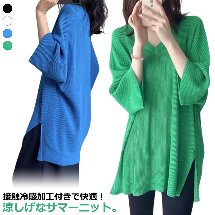トップス レディース ロングtシャツ サマーニット きれいめ 夏ニット 七分袖 涼しい 半袖 夏 接触冷感 ニット トップス 春 Vネック スリット ゆったり ドロップショルダー 無地 カジュアル 大きいサイズ おしゃれ カットソー