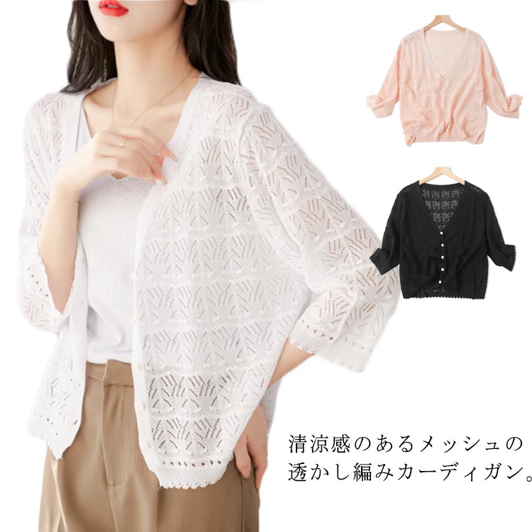 送料無料 透かし柄カーディガン 羽織もの トップス サマーニット 羽織り レディース 体型カバー 透ける 七分袖 レース ドルマン ピンク ゆったり カジュアル風 おしゃれ 冷房対策 UV対策 ホワイト サマーカーディガン