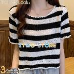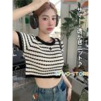 サマーニット 透かしニット ブラウス 丸ネック ボーダーライン Tシャツ 半袖 トップス ボーダー柄 腰見せトップス ショート丈