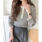 ニット セーター 「新色追加」袖ボタン無地ボーダー長袖リブニットトップス レディース