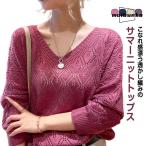 透かし編み トップス ニット 長袖 レディース レイヤード 夏ニット ドルマンスリーブ vネック 薄手 涼しい サマーニット カギ編み シアーニット