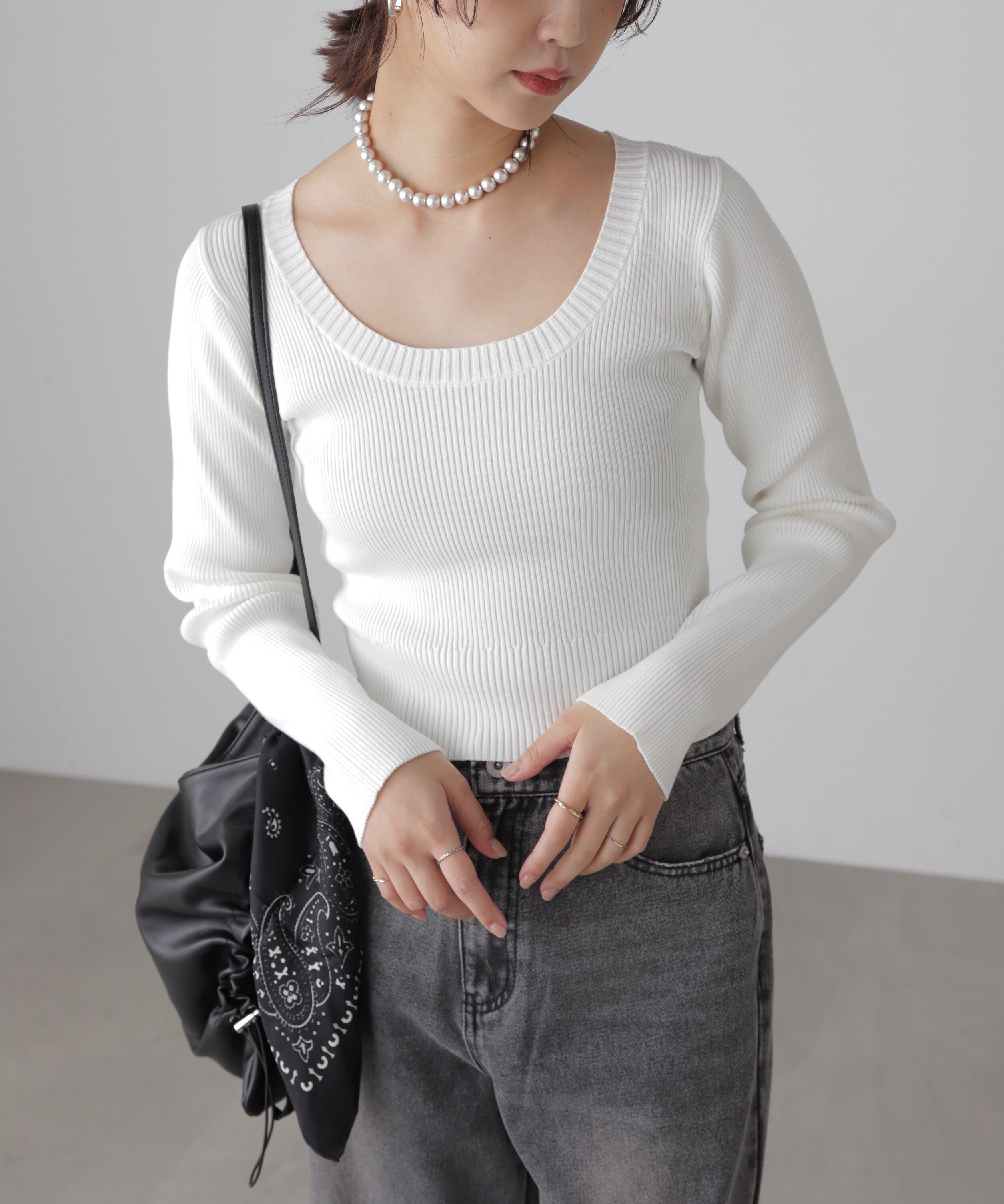 【SALE/50%OFF】FREE'S MART <洗える>マシンウォッシャブルUネックニット フリーズ マート トップス ニット ホワイト グレー オレンジ ブラック