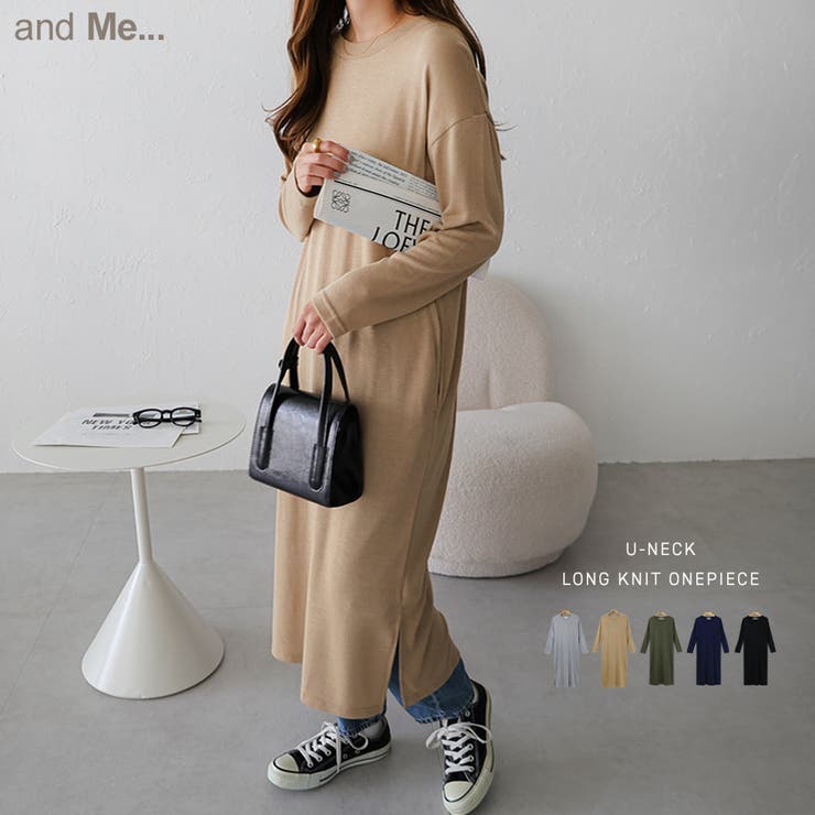 【10%OFFクーポン!12/11(木)1:59まで】andme Uネック ニットソー ワンピース 春 長袖 ロング スリット 薄手 無地 ロング丈 マタニティ M/Lサイズ ワンピース・ドレス