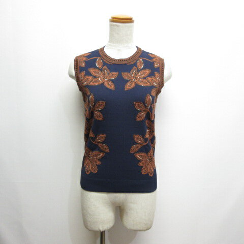 【中古】ヴァレンティノ ヴァレンチノ VALENTINO 美品 ノースリーブ ニット カットソー S ネイビー 紺 茶 総柄 正規品 イタリー製 レディース 【ベクトル 古着】 240530