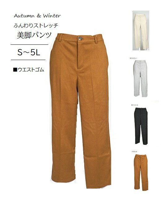 【秋冬もの入荷】ふんわりストレッチ モイスチャーツイル素材 美脚パンツ センタープレス 股下63cm (S~5L)テラコッタ アイボリー 杢ライトグレー 杢チャコール 4色