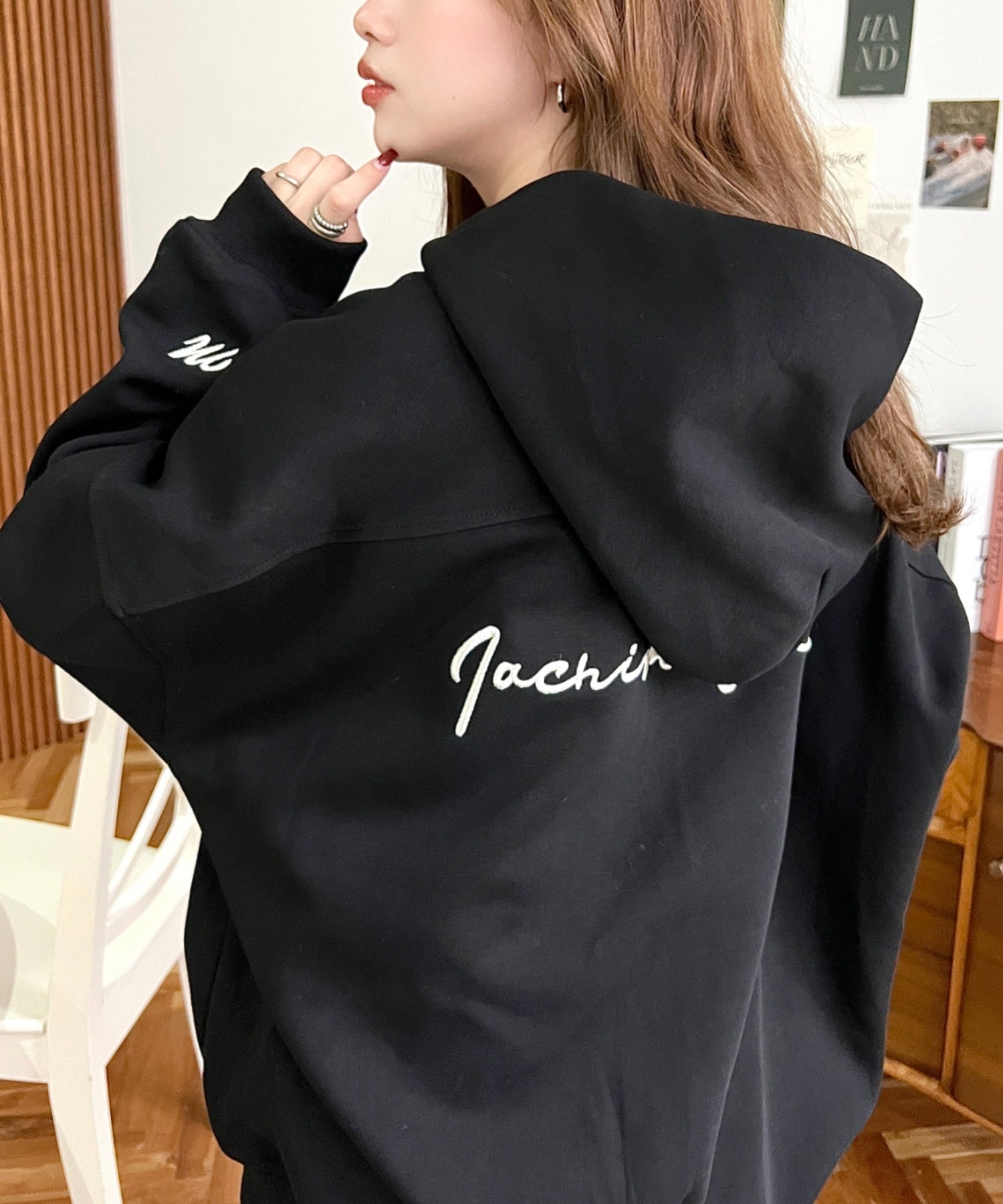 moment+ 袖ワンポイントバック刺繍ジップアップパーカー モーメントプラス トップス パーカー・フーディー ホワイト ベージュ ブラック【送料無料】