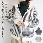 トップス アウター レディース ダブルジップパーカー ニットパーカー 秋 冬 白 黒 おしゃれ 長袖 ボーダー カジュアル 体型カバー^t1129^
