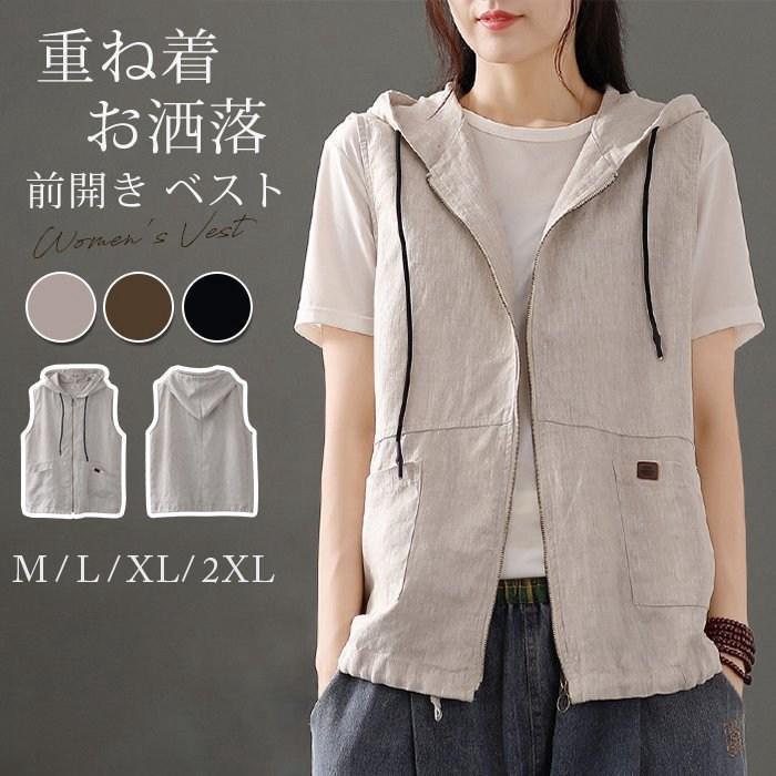 【1枚買い10%OFFクーポン利用で2 322円 】ベスト ジレ レディース トップス ノースリーブ アウター トレンチベスト ジレンチ コート アウター レイヤード 前開き 無地 羽織り 綿麻風 羽織 ライトアウター ショート丈 フード付き パーカー風 春 夏