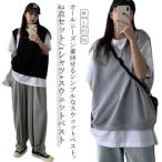 ベスト スウェット レディース 2点セット/tシャツ+スウェットベスト ジレ Vネック チョッキ ベスト ノースリーブパーカー 春 夏 トップス プル
