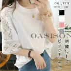 カットソー レディース 春夏 Tシャツ トップス 袖レースデザイン5分袖カットソー 綿 透け感 カジュアル ナチュラル 体型カバー プルオーバー おしゃれ