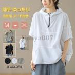 【全品2点で5%OFF】tシャツ 半袖 レディース 夏 シャツブラウス 大きいサイズ フード付き 半袖tシャツ 五分袖 トップス 春 無地 ガーゼシャツ ゆったり 体型カバー