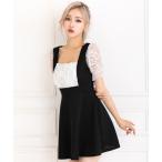 ドレス キャバドレス ミニ フレア 半袖 サロペット風フラワーレースシースルーハイウエスト切替ドレス
