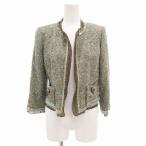 フォクシー ブティック ノーカラー ツイードジャケット スパンコール ラメ ボタンレス ショート丈 38 緑 グリーン 青 ブルー