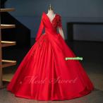 カラードレス レッド 長袖 主役 演奏会 発表会 二次会 花嫁 ウエディングドレス ウェディングドレス ロングドレス Aラインドレス プリンセスドレス