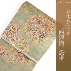 袋帯 フォーマル 絹 礼装 西陣織 井上定機業店謹製 仕立て付き 送料無料 新品 未使用 販売 緑 ゴールド 幾何学 唐草 丸紋 ライン 京都 フワ