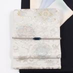 袋帯 未使用 フォーマル 正絹 京都 西陣 金銀糸 オフホワイト 淡ブルーグレー 段霞 丸文 花唐草 新古品 仕立て上がり みやがわ sb54334