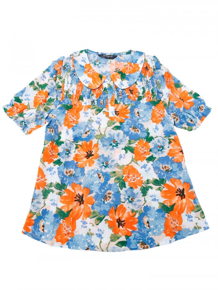 【期間限定10%OFF】Allegra K フリルトップス フローラルブラウス フリルカフス Vネック スモック パフ半袖 レディース オレンジブルー S