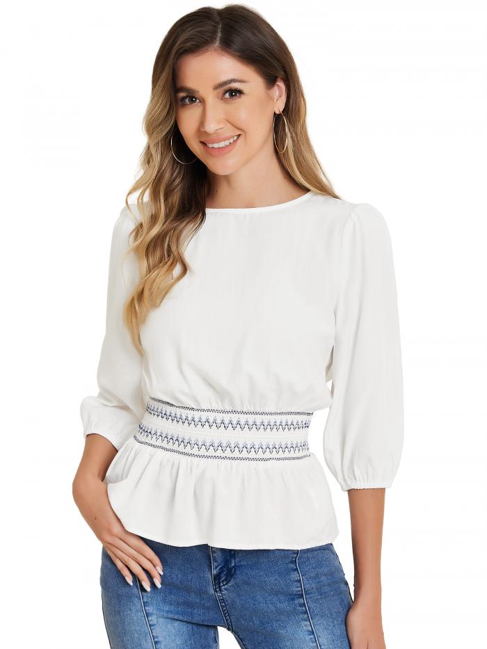 【期間限定10%OFF】Allegra K ラウンドネックトップス 無地シャツ 五分袖ブラウス パフスリーブ ペプラム スモックウエスト レディース ベージュM