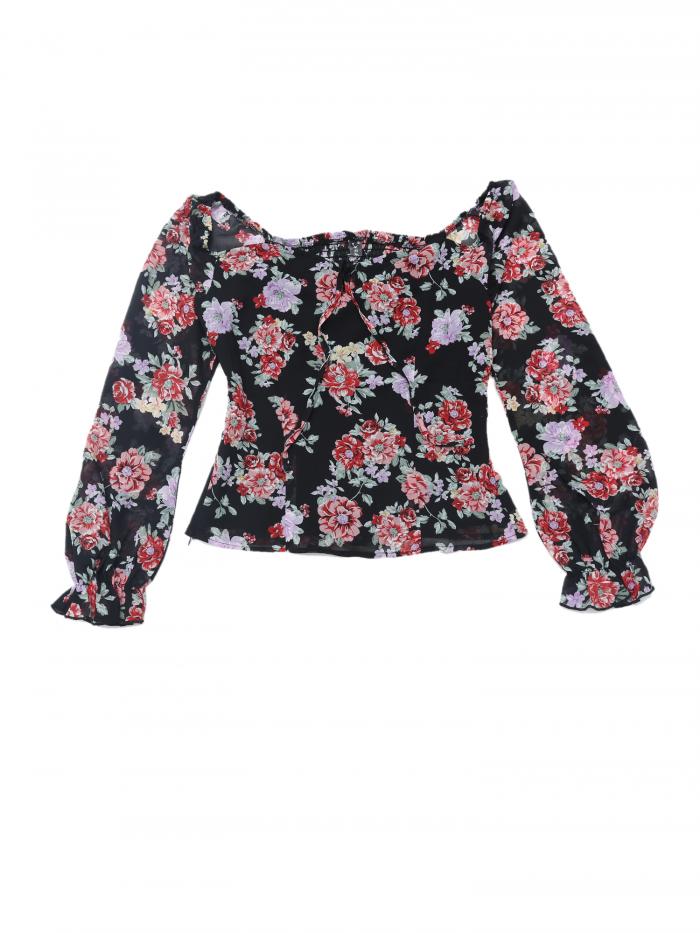 【期間限定10%OFF】Allegra K 花柄トップス 長袖ブラウス 通勤シャツ スモック エレガント パフスリーブ スクエアネック日常 レディース ブラック/黒 M