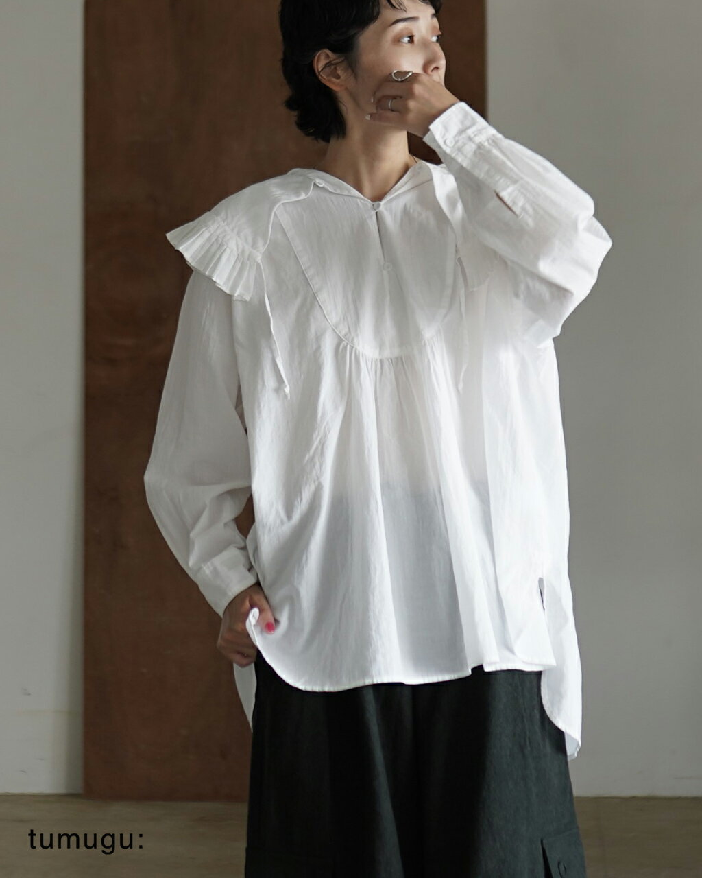 【2点で10%OFFクーポン】ツムグ tumugu ふわふわコットン フリルフードプルオーバー 綿100% 長袖 ブラウス インナー チュニック ナチュラル オフホワイト チャコール レディース TB25302 0908 cpn10