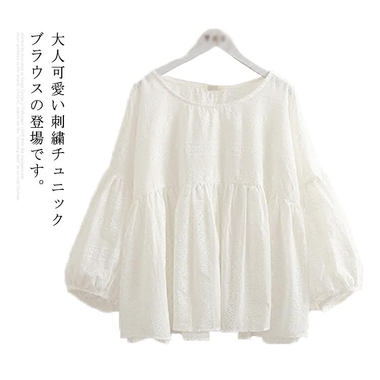 ふんわり袖 刺繍ブラウス チュニック ブラウス トップス 長袖 刺繍トップス フレア Aライン ゆったり 可愛い 白 春夏 コットン 体型カバー 送料無料