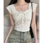 ブラウス シャツ ポコポコ素材でサマームード満点。リボン レース ノースリーブ トップス レディース