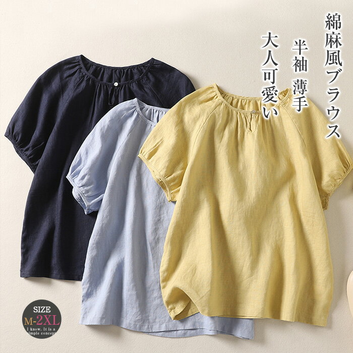 ブラウス レディース 女性 トップス 長袖 パフスリーブ 丸首 ラウンドネック クルーネック プルオーバー 無地 ブルー オフホワイト シンプル カジ