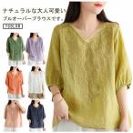 上着 ブラウス おしゃれ プルオーバー シャツ Vネック エスニック 刺繍ブラウス チュニック カジュアル 綿 麻 リネンシャツ バルーン袖 半袖 ゆ