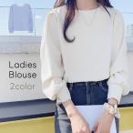 ブラウス レディース 女性 トップス 長袖 パフスリーブ 丸首 ラウンドネック クルーネック プルオーバー 無地 ブルー オフホワイト シンプル カジ