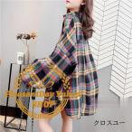 シャツ レディース 長袖 トップス 秋 ブラウス シャツブラウス プルオーバー ゆったり チェック柄 配色 ロング丈 ボリューム袖 カジュアル 2022 秋服