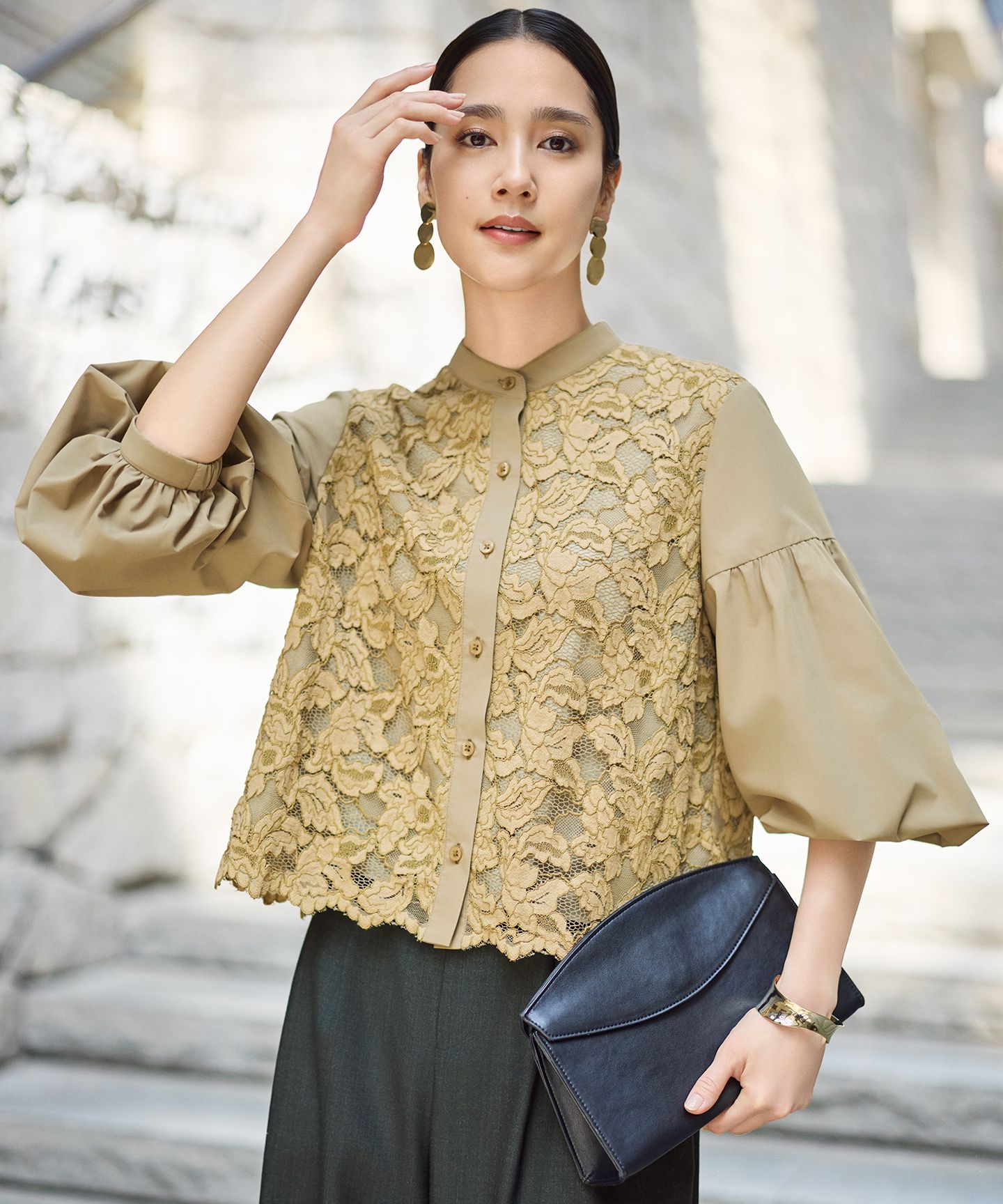 ブラウス レース ドッキング バンドカラー シャツ バルーンスリーブ ゆったり袖 高見え 体型カバー フレア オフィスカジュアル / レースドッキングブラウス