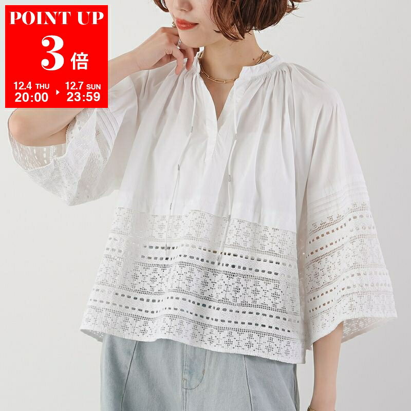Sara mallika サラマリカ ブラウス Cotton Border Gather Lace Top 020151SP5 レディース コットン スキッパー クロシェ レース 刺繍 7分袖 WHITE